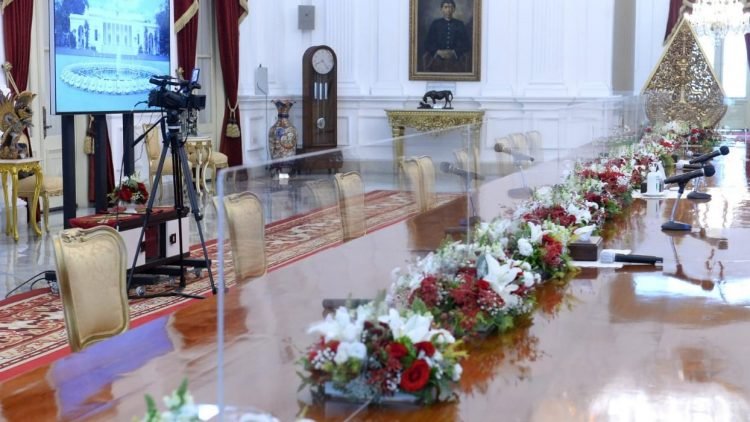 “Di meja oval yang akan menerima tamu-tamu yang diundang oleh Bapak Presiden, kami siapkan pembatas. Pembatas itu artinya kaca akrilik sehingga Bapak Presiden walaupun berhadapan tetap ada batas,” ujarnya.