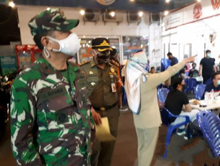 Petugas Satpol PP dibantu personil Kepolisian dan TNI serta jajaran aparatur kelurahan di wilayah Kecamatan Kebayoran Baru, Kamis (17/9), melakukan pengawasan terhadap 36 tempat usaha rumah makan, restoran, cafe dan sejenisnya.