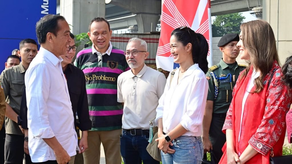 Presiden Joko Widodo mengajak para penggiat seni untuk mencoba moda transportasi Lintas Rel Terpadu (LRT) dalam perjalanan dari Stasiun Jati Mulya, Kabupaten Bekasi menuju Stasiun Dukuh Atas, Jakarta, pada Kamis, 10 Agustus 2023. Dalam kesempatan tersebut, sejumlah penggiat seni menyampaikan kesan-kesannya pertama kali mencoba LRT.