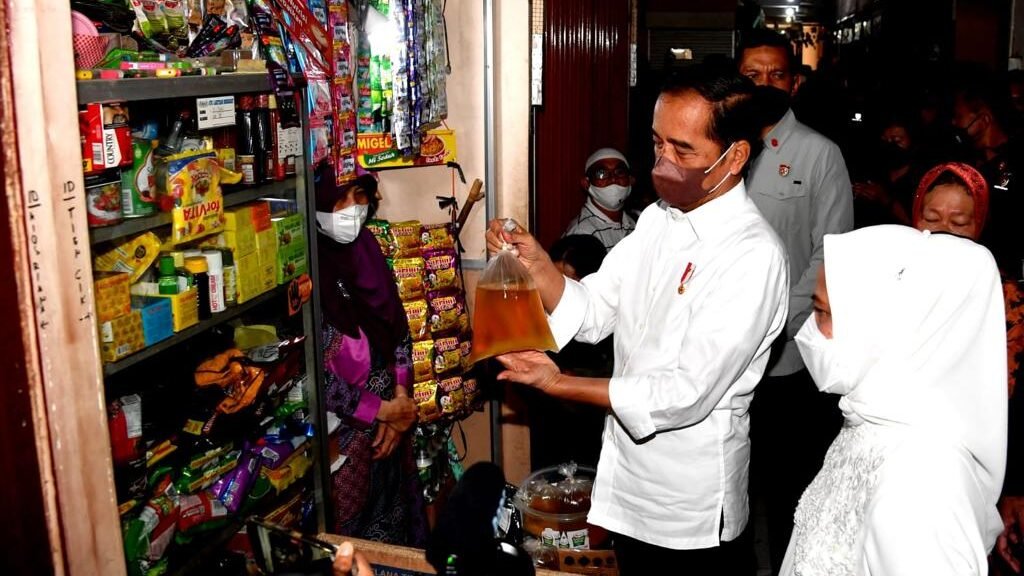 Setibanya di pasar, Presiden bersama Ibu Iriana langsung mengecek harga minyak goreng curah di Pasar Muntilan.