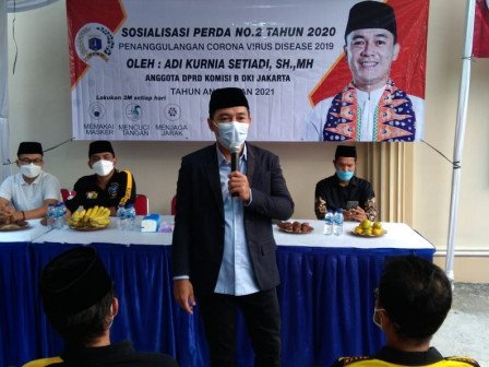 Legislator Komisi B Dewan Perwakilan Rakyat Daerah (DPRD) Provinsi DKI Jakarta, Adi Kurnia Setiadi melaksanakan Sosialisasi Peraturan Daerah (Perda) Nomor 2 Tahun 2020 tentang Penanggulangan Corona Virus Disease 2019 di Pendopo Sahabat Aksi, Jalan Musholla, RT 04/09, Kelurahan Tengah, Kecamatan Kramat Jati, Jakarta Timur.