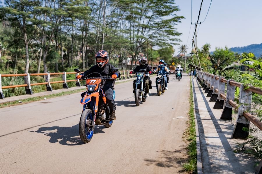 Setelah kurang lebih 1 jam mendengarkan pemaparan materi, para peserta kemudian langsung bergegas menuju motor mereka masing-masing untuk adakan sesi foto bersama terlebih dahulu lengkap dengan riding gear mereka sebelum full gaspol menuju Jonggol. Rute cross country yang melewati daerah perkampungan penduduk dengan kombinasi jalan berbatu dan berlubang serta tikungan tajam, tanjakan, dan turunan curam khas daerah perbukitan Bogor, menjadi suguhan utama Morning Ride kali ini.