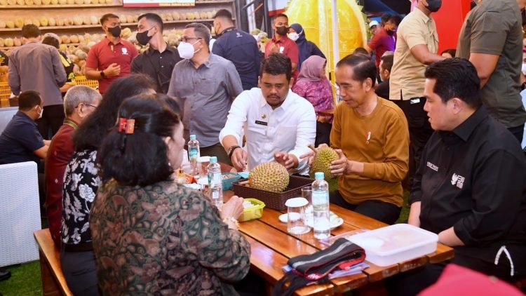 Suasana malam yang hangat menemani Presiden Joko Widodo dan Ibu Iriana Joko Widodo menikmati durian bersama sejumlah pemimpin redaksi (pemred) media nasional dan media lokal Sumatra Utara. Momen tersebut terjadi di Si Bolang Durian, Kota Medan, Provinsi Sumatra Utara, pada Rabu malam, 8 Februari 2023.