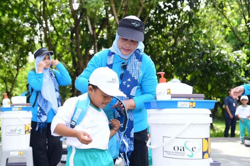 Selain pengembangan pengolahan sampah, dalam kunjungan kerja kali ini, Ibu Iriana dan Ibu Wury juga melakukan sosialisasi cuci tangan pakai sabun dengan menggunakan air mengalir. Beberapa siswa taman kanak-kanak tampak turut serta mempraktikkan gerakan cuci tangan bersama Ibu Iriana, Ibu Wury, dan para anggota OASE KIM.