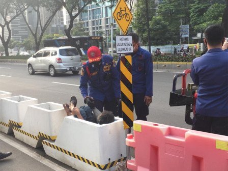 Petugas Suku Dinas Penanggulangan Kebakaran dan Penyelamatan (Sudin Gulkarmat) Jakarta Pusat, Senin (19/4), berhasil mengevakuasi seorang pria diduga Orang Dengan Gangguan Jiwa (ODGJ) yang terjebak pada rongga separator jalur sepeda di Jalan Sudirman.