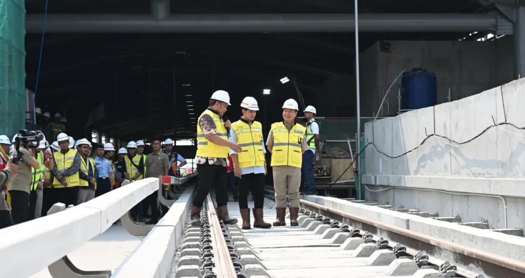 Didampingi Pj. Gubernur DKI Jakarta Teguh Setyabudi dan Walikota Jakarta Timur Muhammad Anwar, Wakil Presiden (Wapres) Gibran Rakabuming meninjau perkembangan pengerjaan jalur Lintas Raya Terpadu (LRT) Fase 1B Velodrome-Manggarai sepanjang 6.4 KM.