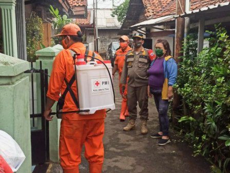 Pemukiman warga RT 14 RW 02 Pinang Ranti, Makasar, Jakarta Timur, Senin (15/2), disemprot cairan disinfektan oleh 25 personel gabungan dari unsur PPSU, Satpol PP, kader PKK, Jumantik, LMK hingga pengurus RT dan RW.