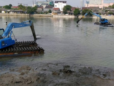 Pengerukan sedimen lumpur di Waduk Tomang Barat, Tanjung Duren Utara, Grogol Petamburan, Jakarta Barat terus dikebut Suku Dinas Sumber Daya Air (Sudin SDA) Jakarta Barat.