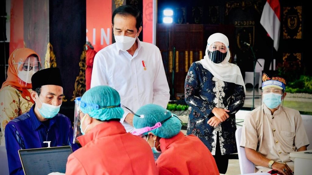 Presiden Joko Widodo dalam kunjungan kerjanya ke Provinsi Jawa Timur pada Senin, 22 Maret 2021, meninjau pelaksanaan vaksinasi massal yang digelar di Pendopo Kabupaten Jombang.