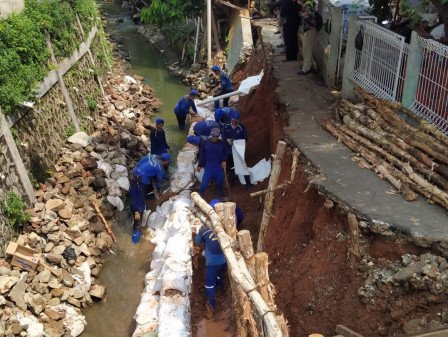 Satpel Sumber Daya Air Kecamatan Kramat Jati, Jakarta Timur, Senin (17/5), melanjutkan proses perbaikan turap longsor sepanjang 30 meter di Jl Batu Sari I, RW 02 Batu Ampar. Sebelumnya pekerjaan sempat diliburkan selama lima hari, menyambut Idulfitri 1442 H.