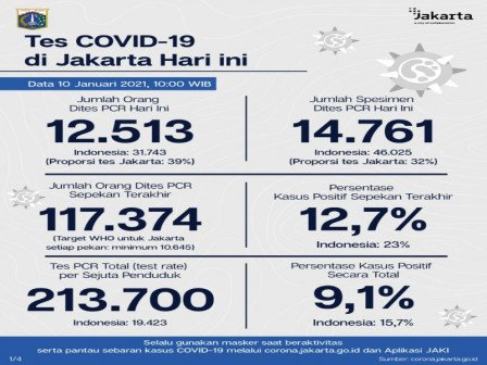 Untuk positivity rate atau persentase kasus positif sepekan terakhir di Jakarta sebesar 12,7%, sedangkan persentase kasus positif secara total sebesar 9,1%. WHO juga menetapkan standar persentase kasus positif tidak lebih dari 5%.