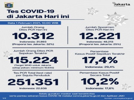 Kepala Bidang Pencegahan dan Pengendalian Penyakit, Dinas Kesehatan Provinsi DKI Jakarta, Dwi Oktavia memaparkan, berdasarkan data terkini Dinas Kesehatan Pemerintah Provinsi DKI Jakarta, dilakukan tes PCR sebanyak 12.221 spesimen. Dari jumlah tes tersebut, sebanyak 10.312 orang dites PCR hari ini untuk mendiagnosis kasus baru dengan hasil 3.093 positif dan 7.219 negatif.