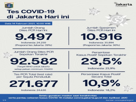 Kepala Bidang Pencegahan dan Pengendalian Penyakit, Dinas Kesehatan Provinsi DKI Jakarta, Dwi Oktavia memaparkan, berdasarkan data terkini Dinas Kesehatan Pemerintah Provinsi DKI Jakarta, dilakukan tes PCR sebanyak 10.916 spesimen. Dari jumlah tes tersebut, sebanyak 9.497 orang dites PCR hari ini untuk mendiagnosis kasus baru dengan hasil 2.496 positif dan 7.001 negatif.