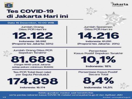 Kepala Bidang Pencegahan dan Pengendalian Penyakit Dinas Kesehatan Provinsi DKI Jakarta, Dwi Oktavia memaparkan, berdasarkan data terkini Dinas Kesehatan Pemerintah Provinsi DKI Jakarta telah dilakukan tes PCR sebanyak 14.216 spesimen. Dari jumlah tes tersebut, hari ini sebanyak 12.122 orang dites PCR untuk mendiagnosis kasus baru dengan hasil 1.221 positif dan 10.901 negatif.