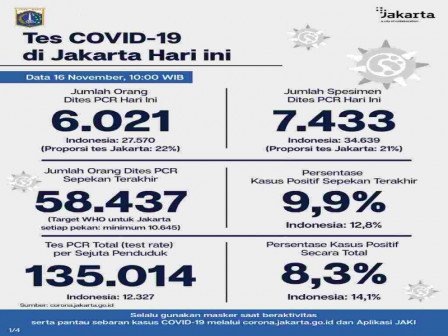 “Untuk rate tes PCR total per 1 juta penduduk sebanyak 135.014. Jumlah orang yang dites PCR sep ekan terakhir sebanyak 58.437,” terangnya seperti dikutip dari Siaran Pers PPID DKI Jakarta, Senin (16/11).