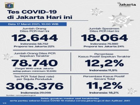 Untuk positivity rate atau persentase kasus positif sepekan terakhir di Jakarta sebesar 12,2%, sedangkan persentase kasus positif secara total sebesar 11,2%. WHO juga menetapkan standar persentase kasus positif tidak lebih dari 5%.