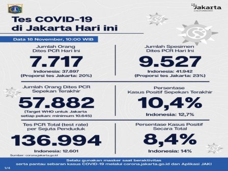 Kepala Bidang Pencegahan dan Pengendalian Penyakit, Dinas Kesehatan Provinsi DKI Jakarta, Dwi Oktavia memaparkan, berdasarkan data terkini Dinas Kesehatan Pemerintah Provinsi DKI Jakarta telah dilakukan tes PCR sebanyak 9.527 spesimen. Dari jumlah tes tersebut, sebanyak 7.717 orang dites PCR hari ini untuk mendiagnosis kasus baru dengan hasil 870 positif dan 6.847 negatif.