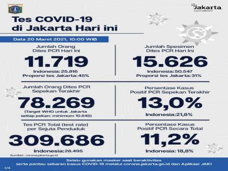 Kepala Bidang Pencegahan dan Pengendalian Penyakit, Dinas Kesehatan Provinsi DKI Jakarta, Dwi Oktavia memaparkan, berdasarkan data terkini Dinas Kesehatan Pemerintah Provinsi DKI Jakarta, dilakukan tes PCR sebanyak 15.626 spesimen. Dari jumlah tes tersebut, sebanyak 11.719 orang dites PCR hari ini untuk mendiagnosis kasus baru dengan hasil 1.937 positif dan 9.782 negatif.