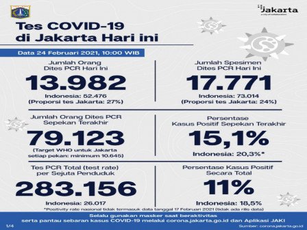 Kepala Bidang Pencegahan dan Pengendalian Penyakit, Dinas Kesehatan Provinsi DKI Jakarta, Dwi Oktavia memaparkan, berdasarkan data terkini Dinas Kesehatan Pemerintah Provinsi DKI Jakarta, dilakukan tes PCR sebanyak 17.771 spesimen. Dari jumlah tes tersebut, sebanyak 13.982 orang dites PCR hari ini untuk mendiagnosis kasus baru dengan hasil 782 positif dan 13.200 negatif.