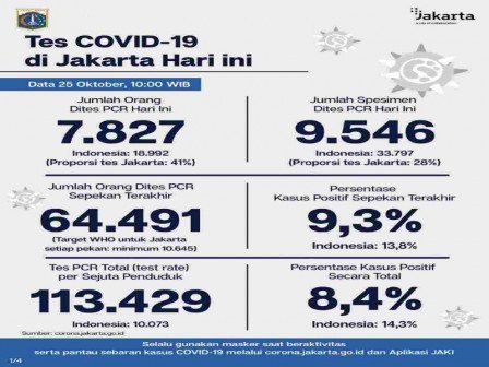 Kepala Bidang Pencegahan dan Pengendalian Penyakit, Dinas Kesehatan Provinsi DKI Jakarta, Dwi Oktavia memaparkan, berdasarkan data terkini Dinas Kesehatan Pemerintah Provinsi DKI Jakarta, dilakukan tes PCR sebanyak 9.546 spesimen. Dari jumlah tes tersebut, sebanyak 7.827 orang dites PCR hari ini untuk mendiagnosis kasus baru dengan hasil 771 positif dan 7.056 negatif.