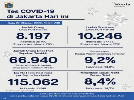 “Untuk rate tes PCR total per 1 juta penduduk sebanyak 115.062. Jumlah orang yang dites PCR sepekan terakhir sebanyak 66.940,” terangnya seperti dikutip dari Siaran Pers PPID Provinsi DKI Jakarta, Selasa (27/10).