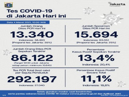 Kepala Bidang Pencegahan dan Pengendalian Penyakit, Dinas Kesehatan Provinsi DKI Jakarta, Dwi Oktavia memaparkan, berdasarkan data terkini Dinas Kesehatan Pemerintah Provinsi DKI Jakarta, dilakukan tes PCR sebanyak 15.694 spesimen. Dari jumlah tes tersebut, sebanyak 13.340 orang dites PCR hari ini untuk mendiagnosis kasus baru dengan hasil 2.008 positif dan 11.332 negatif.