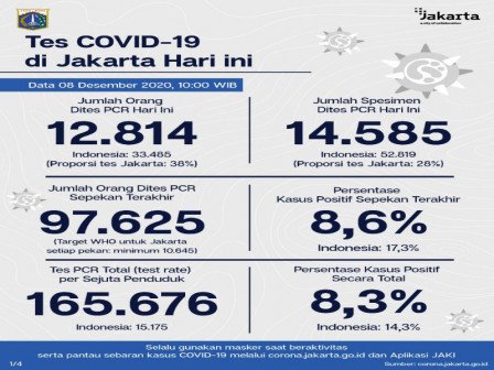 Kepala Bidang Pencegahan dan Pengendalian Penyakit, Dinas Kesehatan Provinsi DKI Jakarta, Dwi Oktavia memaparkan, berdasarkan data terkini Dinas Kesehatan Pemerintah Provinsi DKI Jakarta, dilakukan tes PCR sebanyak 14.585 spesimen.