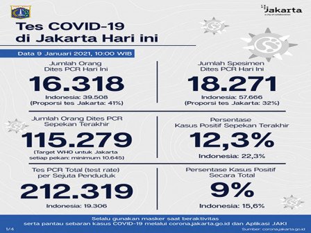 Kepala Bidang Pencegahan dan Pengendalian Penyakit, Dinas Kesehatan Provinsi DKI Jakarta, Dwi Oktavia memaparkan, berdasarkan data terkini Dinas Kesehatan Pemerintah Provinsi DKI Jakarta, dilakukan tes PCR sebanyak 18.271 spesimen. Dari jumlah tes tersebut, sebanyak 16.318 orang dites PCR hari ini untuk mendiagnosis kasus baru dengan hasil 2.424 positif dan 13.894 negatif.
