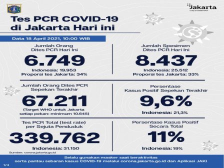 Kepala Bidang Pencegahan dan Pengendalian Penyakit, Dinas Kesehatan Provinsi DKI Jakarta, Dwi Oktavia memaparkan, berdasarkan data terkini Dinas Kesehatan Pemerintah Provinsi DKI Jakarta, dilakukan tes PCR sebanyak 8.437 spesimen.
