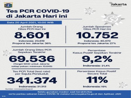 Kepala Bidang Pencegahan dan Pengendalian Penyakit, Dinas Kesehatan Provinsi DKI Jakarta, Dwi Oktavia memaparkan, berdasarkan data terkini Dinas Kesehatan Pemerintah Provinsi DKI Jakarta, dilakukan tes PCR sebanyak 10.752 spesimen. Dari jumlah tes tersebut, sebanyak 8.601 orang dites PCR hari ini untuk mendiagnosis kasus baru dengan hasil 460 positif dan 8.141 negatif. Selain itu, dilakukan pula tes Antigen hari ini sebanyak 3.926 orang dites, dengan hasil 86 positif dan 3.840 negatif.