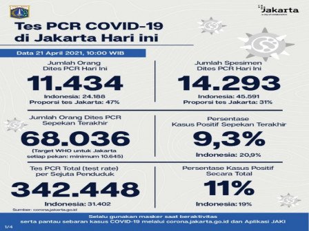 Kepala Bidang Pencegahan dan Pengendalian Penyakit, Dinas Kesehatan Provinsi DKI Jakarta, Dwi Oktavia memaparkan, berdasarkan data terkini Dinas Kesehatan Pemerintah Provinsi DKI Jakarta, dilakukan tes PCR sebanyak 14.293 spesimen. Dari jumlah tes tersebut, sebanyak 11.434 orang dites PCR hari ini untuk mendiagnosis kasus baru dengan hasil 602 positif dan 10.832 negatif. Selain itu, dilakukan pula tes Antigen hari ini sebanyak 5.240 orang dites, dengan hasil 118 positif dan 5.122 negatif.