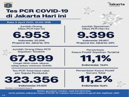 Kepala Bidang Pencegahan dan Pengendalian Penyakit, Dinas Kesehatan Provinsi DKI Jakarta, Dwi Oktavia memaparkan, berdasarkan data terkini Dinas Kesehatan Pemerintah Provinsi DKI Jakarta, dilakukan tes PCR sebanyak 9.396 spesimen. Dari jumlah tes tersebut, sebanyak 6.953 orang dites PCR hari ini untuk mendiagnosis kasus baru dengan hasil 1.337 positif dan 5.855 negatif. Selain itu, dilakukan pula tes Antigen hari ini sebanyak 1.631 orang dites, dengan hasil 30 positif dan 1.601 negatif.