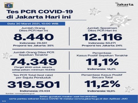 Kepala Bidang Pencegahan dan Pengendalian Penyakit, Dinas Kesehatan Provinsi DKI Jakarta, Dwi Oktavia memaparkan, berdasarkan data terkini Dinas Kesehatan Pemerintah Provinsi DKI Jakarta, dilakukan tes PCR sebanyak 12.116 spesimen. Dari jumlah tes tersebut, sebanyak 8.440 orang dites PCR hari ini untuk mendiagnosis kasus baru dengan hasil 384 positif dan 8.056 negatif. Selain itu, dilakukan pula tes Antigen hari ini sebanyak 3.731 orang dites, dengan hasil 69 positif dan 3.662 negatif.
