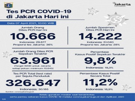 Kepala Bidang Pencegahan dan Pengendalian Penyakit, Dinas Kesehatan Provinsi DKI Jakarta, Dwi Oktavia memaparkan, berdasarkan data terkini Dinas Kesehatan Pemerintah Provinsi DKI Jakarta, dilakukan tes PCR sebanyak 14.222 spesimen. Dari jumlah tes tersebut, sebanyak 10.666 orang dites PCR hari ini untuk mendiagnosis kasus baru dengan hasil 862 positif dan 9.804 negatif. Selain itu, dilakukan pula tes Antigen hari ini sebanyak 3.665 orang dites, dengan hasil 74 positif dan 3.591 negatif.
