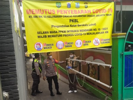 Tujuh personel gabungan dari unsur tiga pilar Kelurahan Ciracas, Kecamatan Ciracas, Jakarta Timur, melakukan pengawasan penerapan Pengendalian Ketat Berskala Lokal (PKBL)  atau lockdown mini di pemukiman warga RT 06/03, menyusul adanya delapan KK atau 24 jiwa yang terpapar COVID 19.