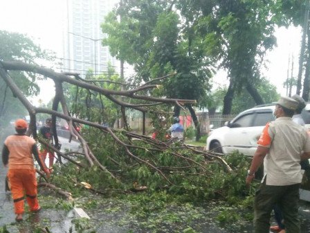 “Yang tumbang pohon trembesi setinggi lima meter dengan diameter 20 sentimeter. Saat ini 20 petugas gabungan dari Sudin Gulkarmat, Satgas Pertamanan dan Hutan Kota Kecamatan Kebon Jeruk dan petugas PPSU masih melakukan evakuasi,” ujar Saumun, Camat Kebon Jeruk, Rabu (14/4).
