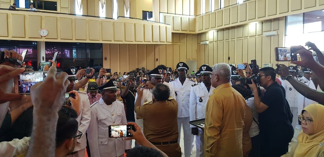 “11 Kepala kampung akan kita tinjau dan evaluasi kembali agar tidak menjadi permasalahan yang berkepanjangan, namun selain itu, Kepala kampung yang disepakati akan tetap dilantik hari ini,” Ucap Johannes Rettob