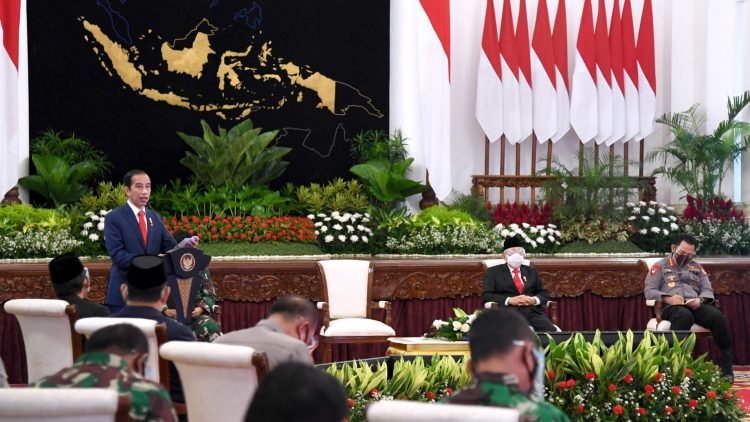 Presiden Republik Indonesia Joko Widodo memberikan pengarahan pada Rapat Pimpinan/Rapim TNI-Polri di Istana Negara, Jakarta pada Senin, 15 Februari 2021.