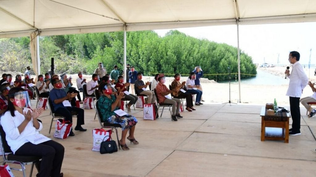 Presiden Jokowi memberikan bantuan modal kerja (BMK) bagi para pelaku usaha mikro dan kecil yang berasal dari Labuan Bajo di Lokasi Proyek Pembangunan Terminal Multifungsi Labuan Bajo, Kabupaten Manggarai Barat, Provinsi Nusa Tenggara Timur, Kamis, 1 Oktober 2020.