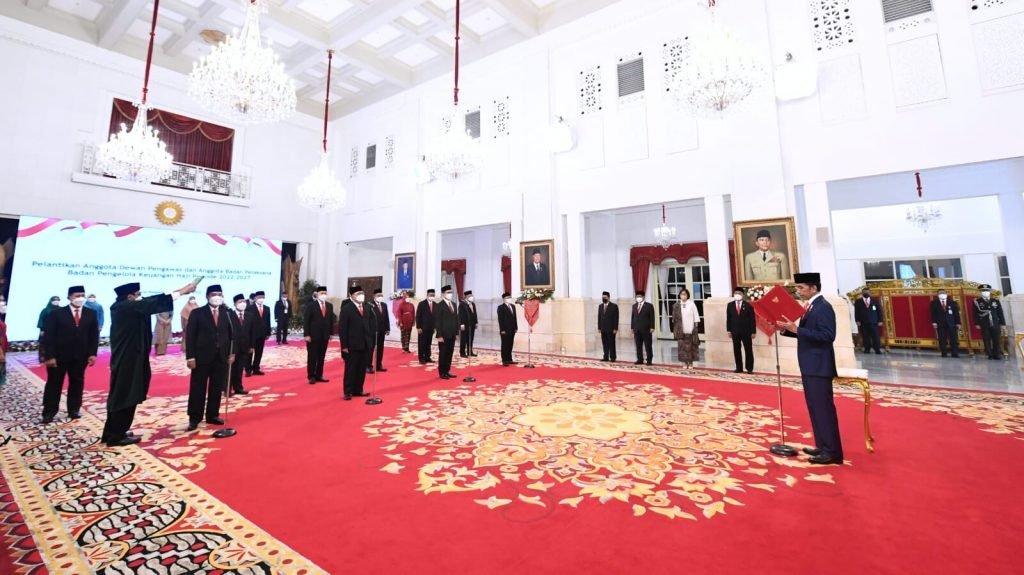 Presiden Joko Widodo melantik dan mengambil sumpah jabatan Anggota Dewan Pengawas Badan Pengelola Keuangan Haji (BPKH) dan Anggota BPKH periode 2022-2027. Acara pelantikan berlangsung di Istana Negara, Jakarta, pada Senin, 17 Oktober 2022.