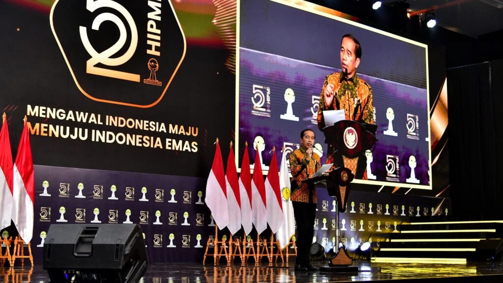 Presiden Joko Widodo menghadiri Hari Ulang Tahun (HUT) Himpunan Pengusaha Muda Indonesia (Hipmi) ke-52 yang digelar di Hotel Fairmont Jakarta, pada Senin, 10 Juni 2024. Dalam sambutannya, Kepala Negara menyoroti beberapa aspek kunci yang harus diperhatikan untuk mewujudkan visi Indonesia Emas pada tahun 2045.