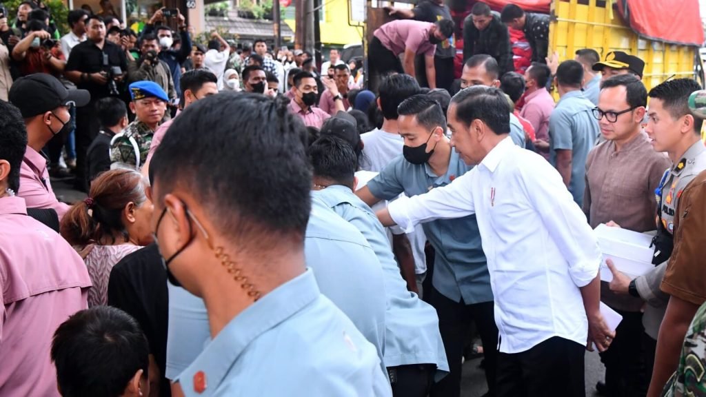 Presiden Joko Widodo membagikan bantuan sembako hingga hamper untuk masyarakat di Jalan Otista, Kota Bogor, Provinsi Jawa Barat pada Jumat, 14 April 2023.
