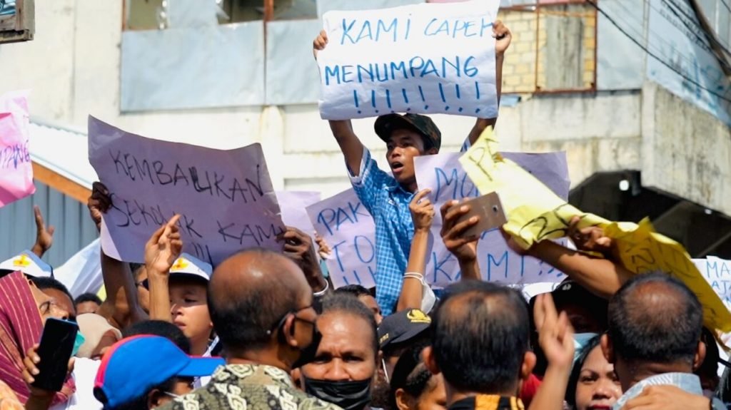 “Gimana… gimana,” kata Presiden kepada tiga orang ibu yang menjadi perwakilan. “Anak-anak kami tidak bisa sekolah Pak, karena sekolahnya dipalang karena tanah ulayat,” ucap salah seorang perwakilan.