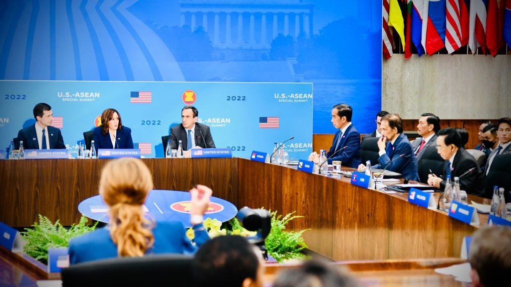 Presiden Joko Widodo menyampaikan tiga poin penting terkait penanganan perubahan iklim dalam pertemuan para pemimpin negara-negara ASEAN dengan Wakil Presiden AS Kamala Harris di Departemen Luar Negeri AS, Washington DC, Jumat, 13 Mei 2022.