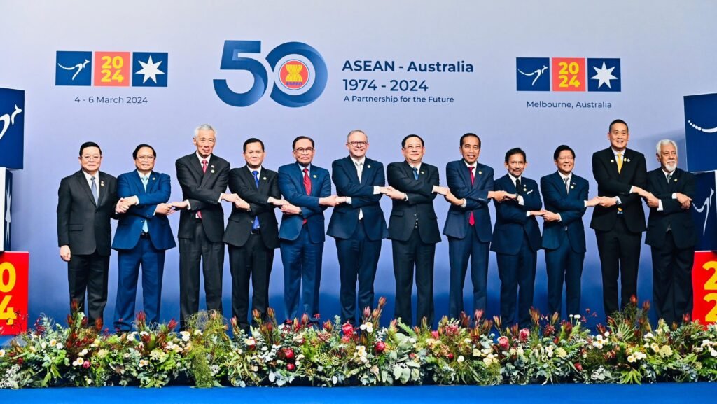 Presiden Joko Widodo menghadiri resepsi yang digelar Perdana Menteri (PM) Australia Anthony Albanese dalam rangka Konferensi Tingkat Tinggi (KTT) Khusus ASEAN-Australia di Melbourne Convention and Exhibition Center (MCEC), Melbourne, Australia pada Selasa, 5 Maret 2024. Presiden Jokowi tiba di ASEAN Leaders’ Arrival Hall, MCEC, sekitar pukul 17.05 waktu setempat dan langsung disambut oleh PM Albanese.