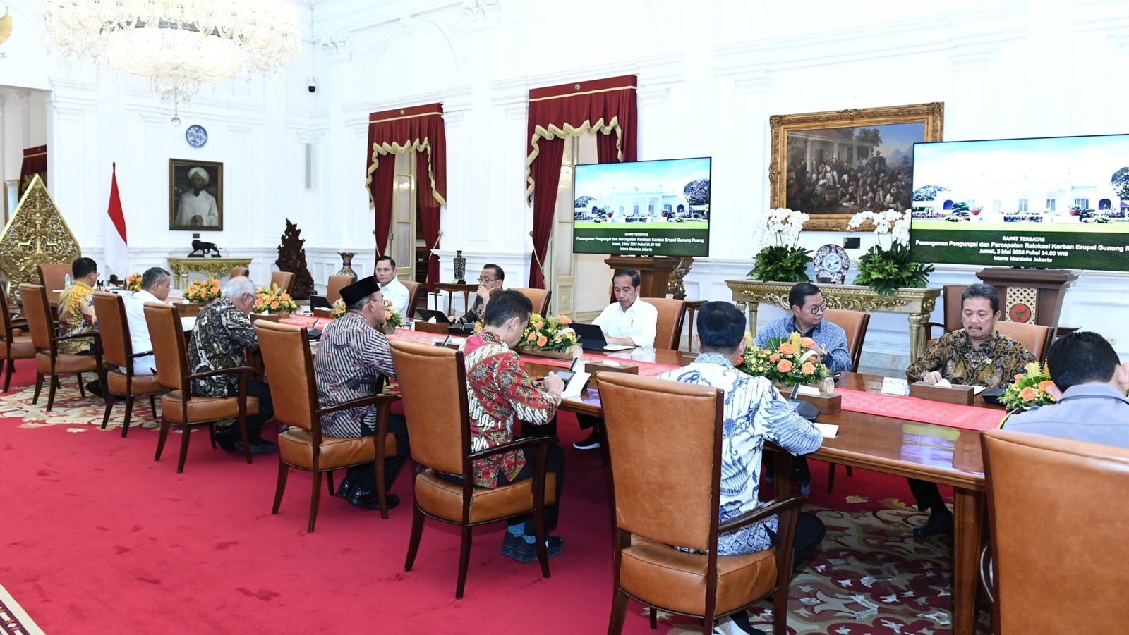 Presiden Joko Widodo menggelar rapat terbatas bersama sejumlah Menteri Kabinet Indonesia Maju, pada Jumat, 3 Mei 2024, di Istana Merdeka, Jakarta. Dalam rapat tersebut, Kepala Negara memberikan sejumlah instruksi kepada jajarannya terkait penanganan pengungsi akibat erupsi Gunung Ruang di Sulawesi Utara beberapa waktu yang lalu.