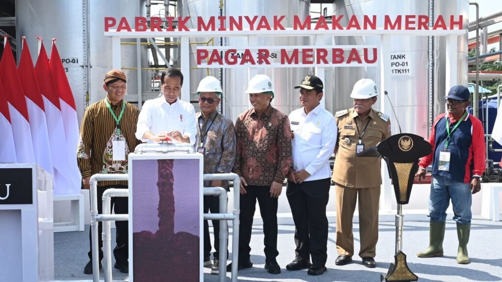 Presiden Joko Widodo meresmikan pabrik percontohan minyak makan merah Pagar Merbau di Kabupaten Deli Serdang, Provinsi Sumatra Utara, pada Kamis, 14 Maret 2024. Peresmian pabrik minyak makan merah pertama di Indonesia tersebut menandai langkah maju dalam industri kelapa sawit nasional dan pemberdayaan petani.