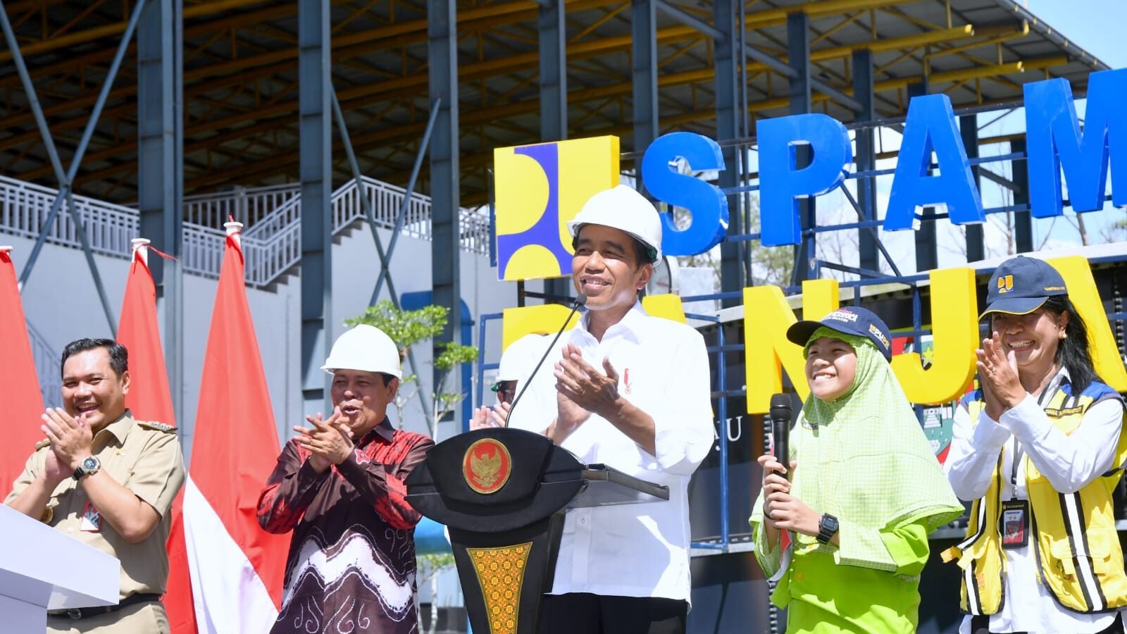 “SPAM (Sistem Penyediaan Air Minum) yang kita bangun di sini untuk tahapan yang kedua. (Ini) menghabiskan anggaran Rp787 miliar, banyak sekali. Dan ini bisa menyuplai 60 ribu rumah tangga yang memerlukan air minum,” ucap Presiden.