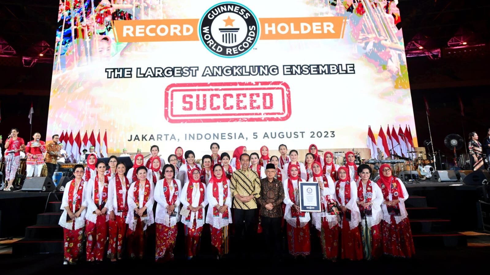 Presiden Joko Widodo dan Wakil Presiden Ma’ruf Amin turut hadir dan menyaksikan pemecahan rekor dunia Guinness World of Record untuk pergelaran angklung terbesar di dunia. Upaya pemecahan rekor tersebut digelar di Stadion Utama Gelora Bung Karno, Jakarta, pada Sabtu, 5 Agustus 2023.