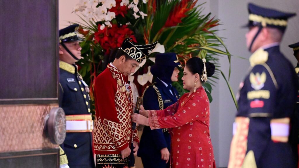 Ibu Negara, Iriana Jokowi, tak kalah anggun dengan balutan pakaian adat Nusantara yang merupakan kolaborasi dari berbagai pakaian tradisional daerah di Indonesia. Mengenakan pakaian dengan warna senada, Ibu Iriana menampilkan perpaduan yang serasi, menambah kesan keanggunan dan harmoni pada penampilannya.